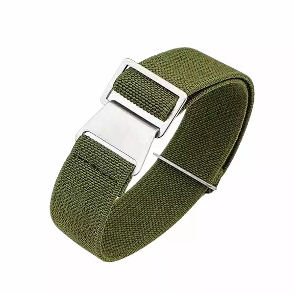 Vihreä joustava nato-ranneke. Ranneke on paksuudeltaan noin 1,5 mm ja se on valmistettu kestävästä ja venyvästä nailonista. Rannekkeen terässolki on hopean sävyinen. Rannekkeen leveys on valittavissa, joko 18 mm, 20 mm tai 22 mm. Ranneke sopii myös hyvin isoille ranteille. Säädettävä ranneke sopii ranteille, joiden ympärysmitta on alkaen noin 17 cm. Pienimpään mahdolliseen ympärysmittaan vaikuttaa myös kellon halkaisija. Nylonranneke on kevyt ja se hylkii likaa ja hikeä.