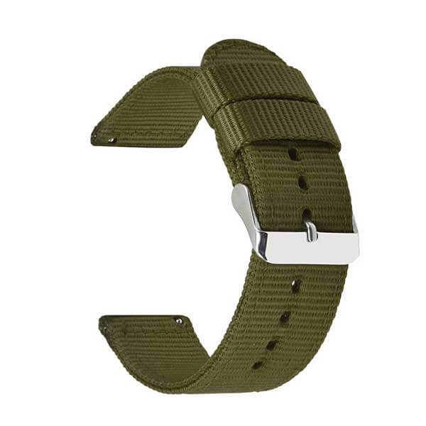 Maastonvihreä kangasranneke, joka on valmistettu kestävästä tekstiilistä. Kangasranneke on kevyt ja se hylkii likaa ja hikeä. Rannekkeen solki on hopean sävyinen. Rannekkeen leveys on valittavissa, joko 18 mm, 20 mm tai 22 mm. Rannekkeen kokonaispituus on 200 mm. Rannekkeessa on pikakiinnitys eli se on helppo vaihtaa kelloon ilman työkaluja.