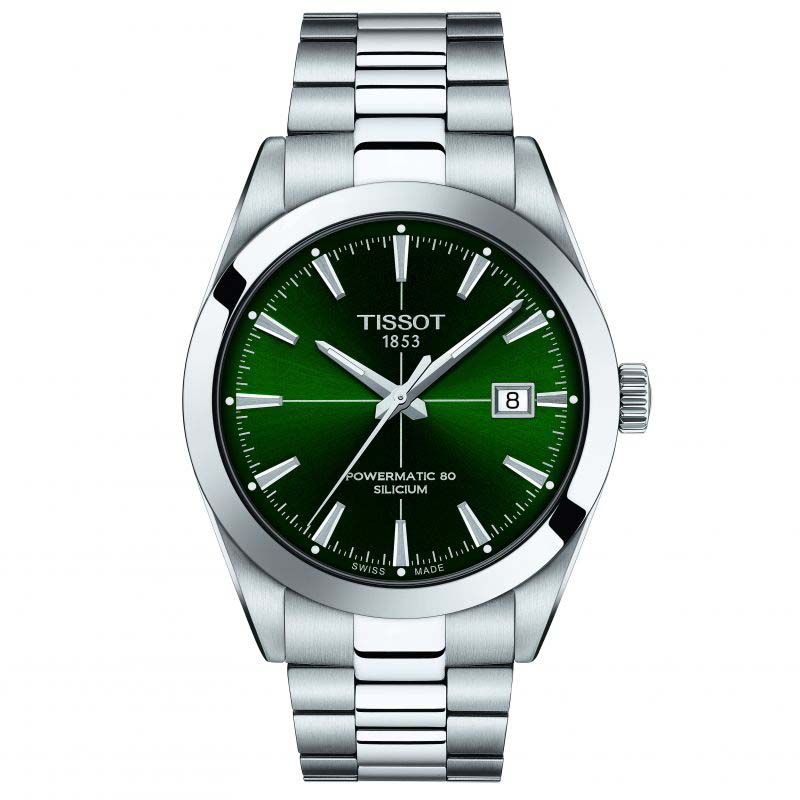 Tyylikäs miesten pukukello Tissot Gentleman Powermatic 80 Silicium, jossa on laadukas Powermatic 80 -automaattikoneisto. Kellon runko ja ranneke ovat valmistettu laadukkaasta ruostumattomasta teräksestä. Kellotaulussa on hopean väriset viivaindeksit ja päivämääränäyttö on kello kolmen kohdalla. Vihreää 40 mm leveää kellotaulua suojaa toiselta puolelta heijastamattomalla pinnoitteella käsitelty, erittäin kestävä ja naarmuuntumaton safiirilasi. Powermatic 80 koneistossa on jopa 80 tunnin käyntivara, joka riittää jatkamaan ajan näyttämistä tarkasti, vaikka kelloa ei käytettäisi kolmeen päivään. Koneiston huikeaa toimintaa voit nähdä kestävän lasipohjan läpi. Kello on vesitiivis 100 metriin saakka, jolloin kello kestää pintauimista.