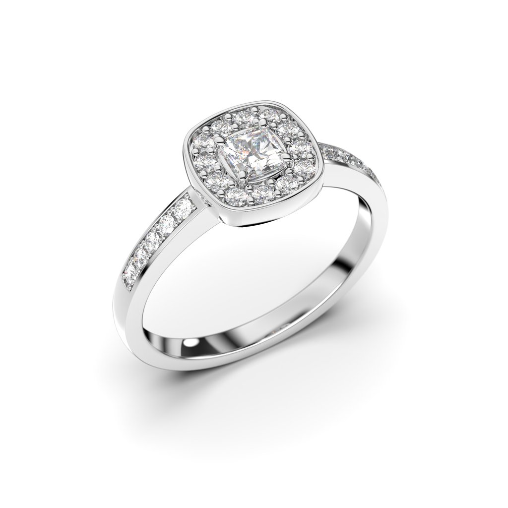 Festiven valkokultainen halo-sormus sivukivillä. Alicia timanttisormus on ihastuttava halo-sormus, jonka keskellä on säihkyvä 0,21 ct:n asscher-hiottu timantti. Neliönmuotoista istutusta reunustaa kauniisti raeistutetut kymmenen timanttia ja säihke jatkuu rungon sivukiviin asti, jotka ovat yhteispainoltaan 0,22 ct. Sormus on valmistettu valkokullasta, kullan pitoisuuden voit valita kolmesta eri vaihtoehdosta 9k, 14k tai 18k. Sormuksen rungon leveys on 2,1 mm ja profiili on flakka, kevyesti pyöristetty vahva runko. Alicia timanttisormusta on saatavilla myös kelta- ja punakultaisena.