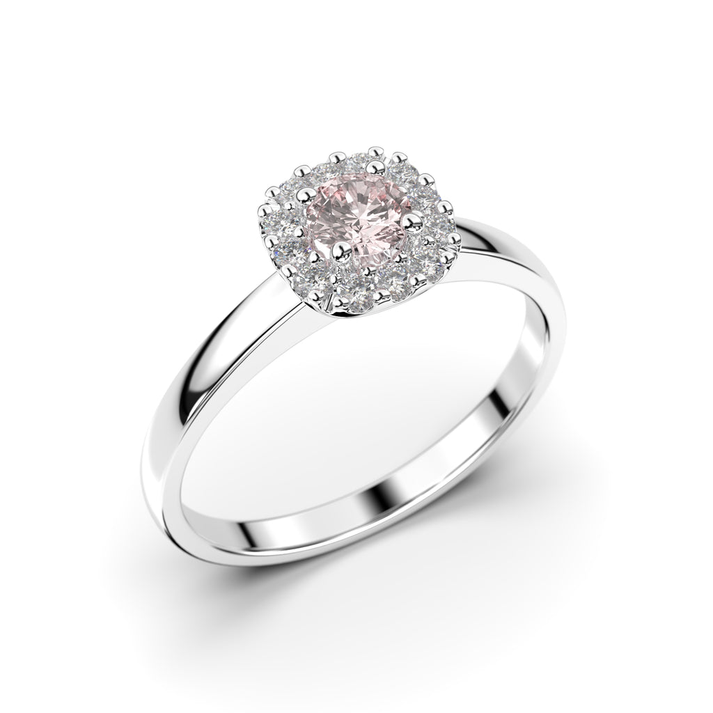 Tyylikäs ja näyttävä Festiven valkokultainen Janette halosormus. Janette on tyylikäs halosormus, jonka keskipisteenä säihkyy hennon vaaleanpunainen 0,18 ct morganiitti. Keskikiveä ympäröi 12 pienempää, mutta kauniisti säkenöivää timanttia. Sormus on valmistettu laadukkaasta valkokullasta, kullan pitoisuuden voit valita kolmesta eri vaihtoehdosta; 9K, 14K tai 18K. Sormuksen siron ja suoran flakkaprofiilisen rungon leveys on 1,9 mm. Janette timanttisormus sopii käytettäväksi yksinään sekä yhdistettynä toisen sormuksen rinnalle, erityisen hyvin halosormuksen rinnalle istuu rivitimanttisormus. Sormus on saatavilla myös kelta- ja punakultaisena.
