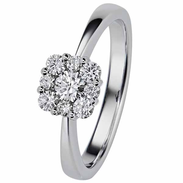 Kohinoor Dahlia Cushion halo-sormus. Tässä valkokultaisessa halo-sormuksessa timantit on istutettu 0,15 ct keskikiven ympärille neliön muotoon. Timantteja yht. 0,39 ct.