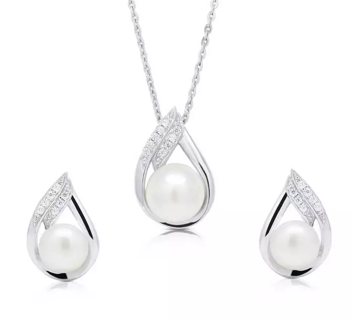 Kaunis helmikorusetti aidoilla makeanveden helmillä ja kirkkailla zirkonia-korukivillä. Korusetin materiaali on laadukas nikkelitön 925 sterling-hopea.