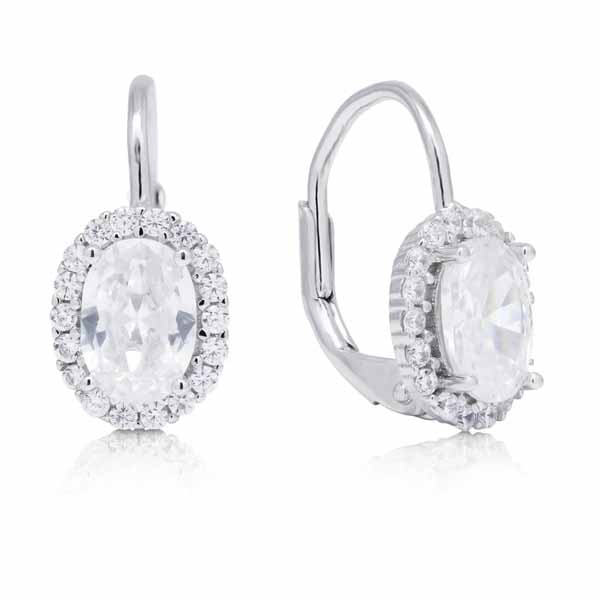 Näyttävät hopeiset korvakorut, joita koristavat kirkkaat zirkonia-korukivet. Suurempaa keskikiveä kehystävät halomaisesti pienemmät zirkoniat. Koruosan koko on 8 x 17 mm.