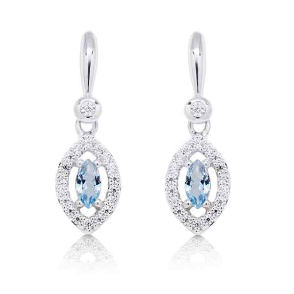 Hopeiset roikkuvat korvakorut ovaalin muotoisilla vaaleansinisillä zirkonia-korukivillä. Keskikiviä ympäröivät kirkkaat zirkoniat. Korvakorun koko on 6,5 x 20 mm.