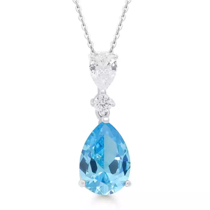 Kirkkailla ja vaaleansinisellä zirkonia-korukivellä koristeltu hopeinen pisaran muotoinen riipus. Hopeaketju on kätevästi säädettävissä pituuksiin 40-45 cm. Valmistusmateriaali on 925 sterling-hopea.