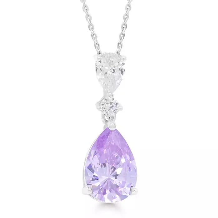 Kirkkailla ja vaaleanlilalla zirkonia-korukivellä koristeltu hopeinen pisaran muotoinen riipus. Hopeaketju on kätevästi säädettävissä pituuksiin 40-45 cm. Valmistusmateriaali on 925 sterling-hopea.
