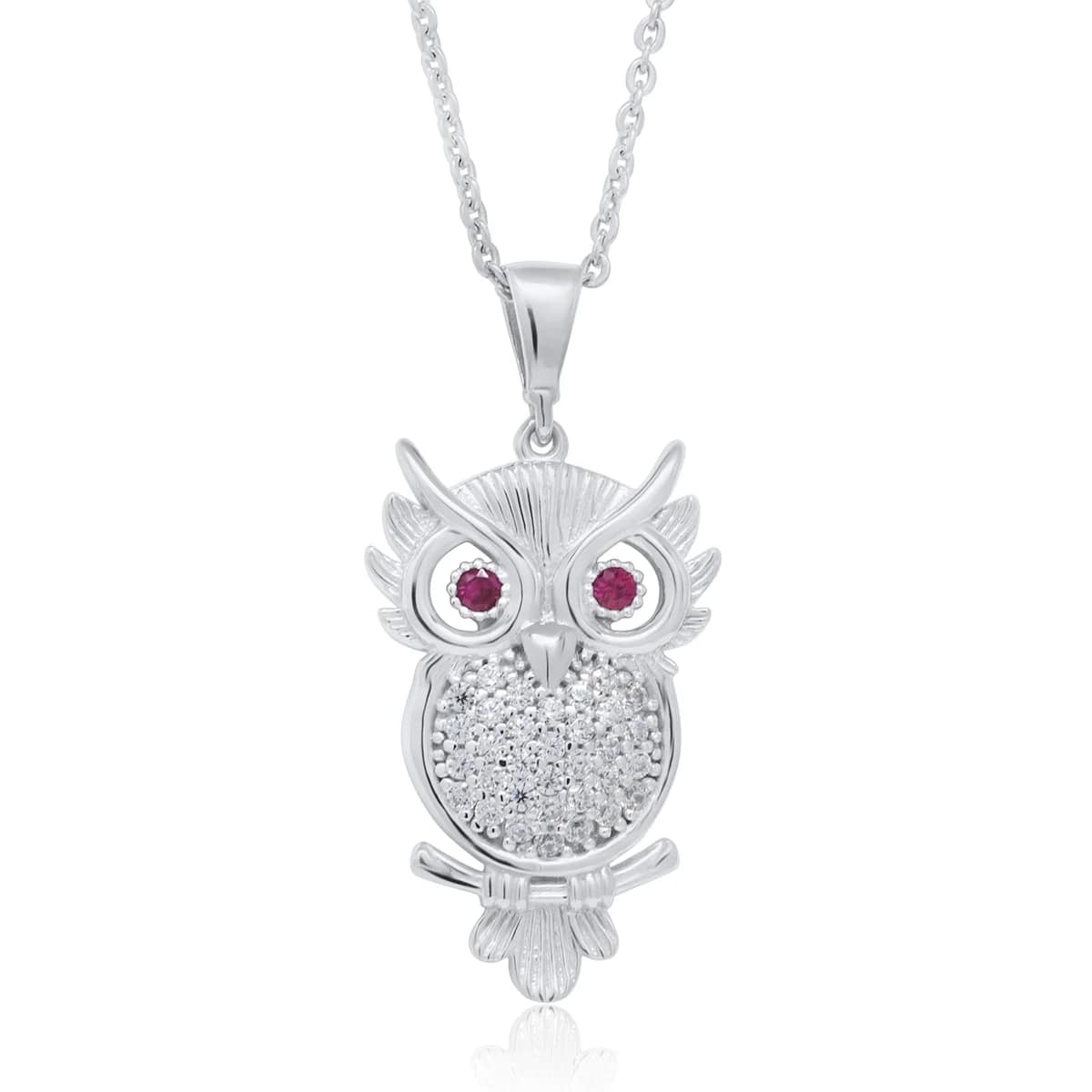 Suloinen pöllö-hopeariipus, joka on koristeltu kirkkailla zirkonia-korukivillä. Pöllön silminä toimivat rubiininpunaiset zirkoniat. Riipuksen koko on 13 x 21,5 mm. Hopeaketjun pituus on kätevästi säädettävissä välillä 40-45 cm. Tämä kaulakoru on valmistettu laadukkaasta 925 hopeasta.