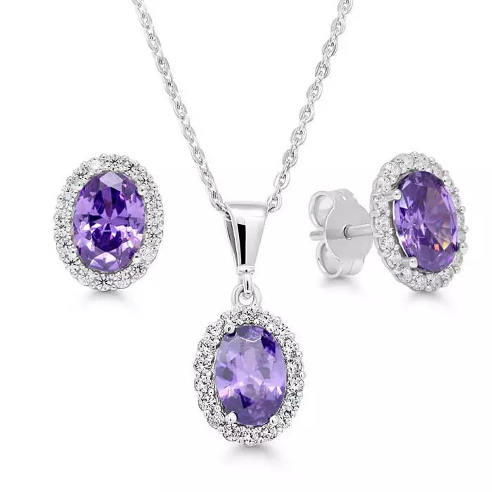Beat of Love kaulakoru ja korvakorut ovaalin muotoisella ametistin värisellä zirkonialla ja kirkkailla zirkoneilla. Korusetin materiaali on laadukas nikkelitön 925 sterling-hopea.