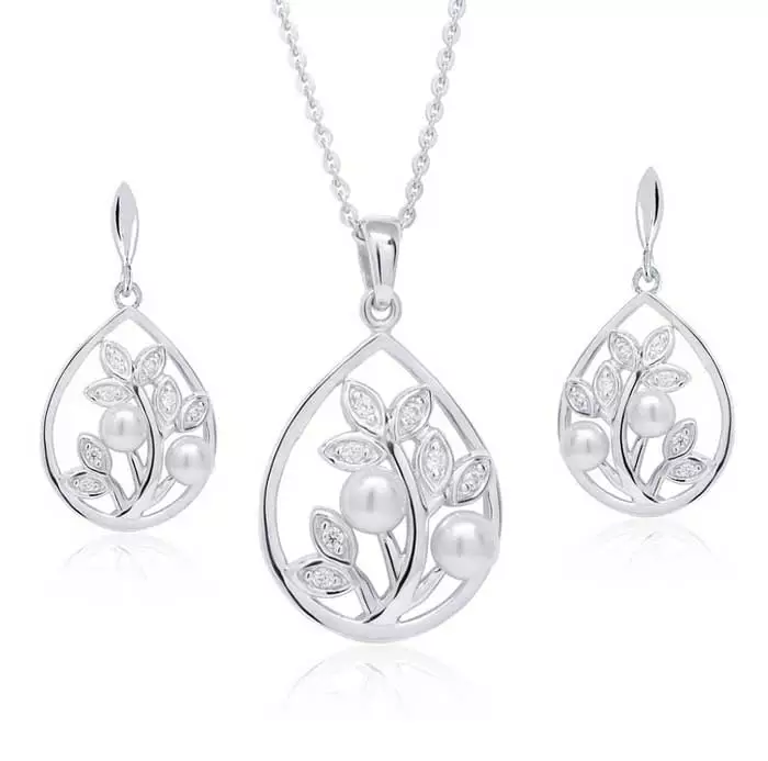 Kaunis helmikorusetti aidoilla makeanveden helmillä ja kirkkailla zirkonia-korukivillä. Korusetin materiaali on laadukas nikkelitön 925 sterling-hopea.