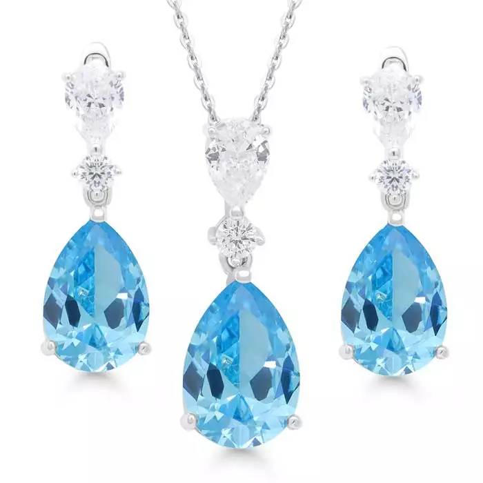 Kaunis hopeakorusetti vaaleansinisillä ja kirkkailla zirkonia-korukivillä. Korusetin materiaali on laadukas nikkelitön 925 sterling-hopea.