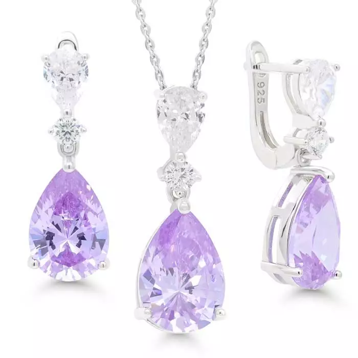 Kaunis hopeakorusetti laventelin sävyisillä ja kirkkailla zirkonia-korukivillä. Korusetin materiaali on laadukas nikkelitön 925 sterling-hopea.