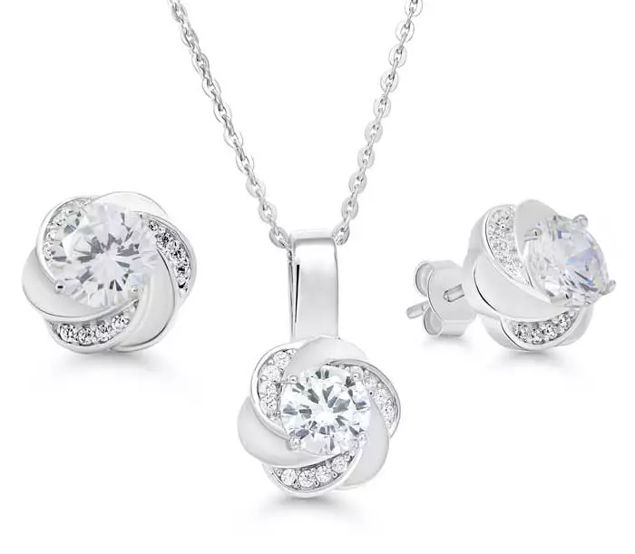 Kaunis hopeakorusetti kirkkailla zirkonia-korukivillä. Korusetin materiaali on laadukas nikkelitön 925 sterling-hopea.