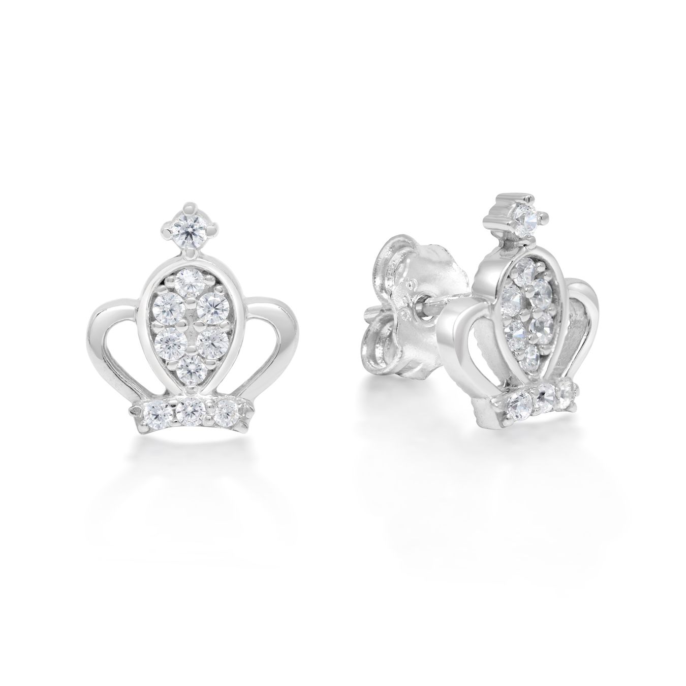 Hopeiset kruunukorvakorut, joita koristavat kirkkaat zirkonit. Kruunun koko on 9 x 7,5 mm. Hopeakorvakorut on valmistettu 925 hopeasta ja niissä on tukeva tappikiinnitys.