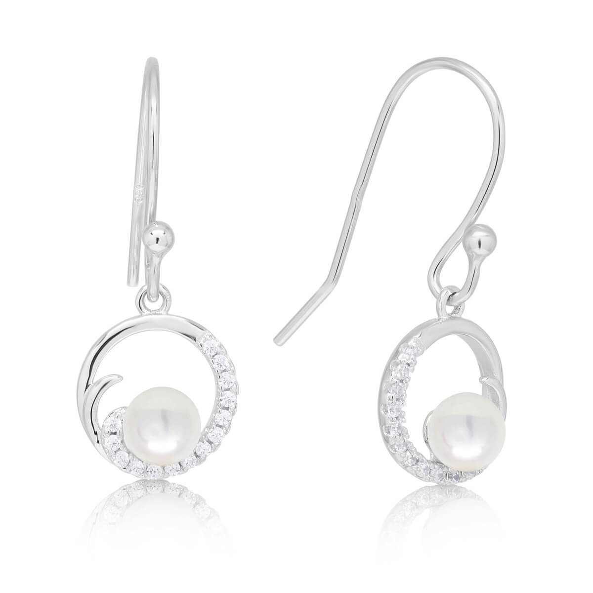 Hienostuneet hopeiset roikkuvat korvakorut, joita koristavat aidot makeanveden viljellyt helmet sekä kirkkaat zirkonia-korukivet. Koruosan koko on 10 mm. Materiaali 925 hopea.