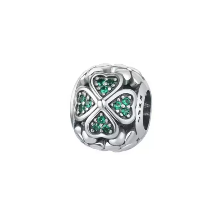 Tuo onnea rannekoruusi tällä pyöreällä Charmiella-hopeahelalla. Helan pintaa koristaa runsas neliapilakuviointi, jossa sirot hopeiset apilat vuorottelevat suurempien, vihreillä zirkonia-kivillä koristeltujen apiloiden kanssa. Tämä ketjuun pujotettava hela on valmistettu aidosta 925 sterling-hopeasta. Helan halkaisija on 10 mm ja leveys 9 mm.