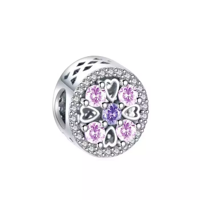 Tämä pyöreä charmiella-hopeahela yhdistää kaunista symboliikkaa ja lempeitä värejä. Korun ulkoreunaa kiertää säihkyvä kehä kirkkaita zirkonia-kiviä. Keskiössä on neljä vaaleanpunaista zirkoniaa, jotka ympäröivät keskimmäistä lilaa kiveä. Kivien lomassa on sirot, läpileikatut hopeasydämet, jotka tuovat koruun ilmavuutta. Tämä ketjuun pujotettava hela on valmistettu aidosta 925 sterling-hopeasta. Helan halkaisija on 10,5 mm ja syvyys 10 mm.