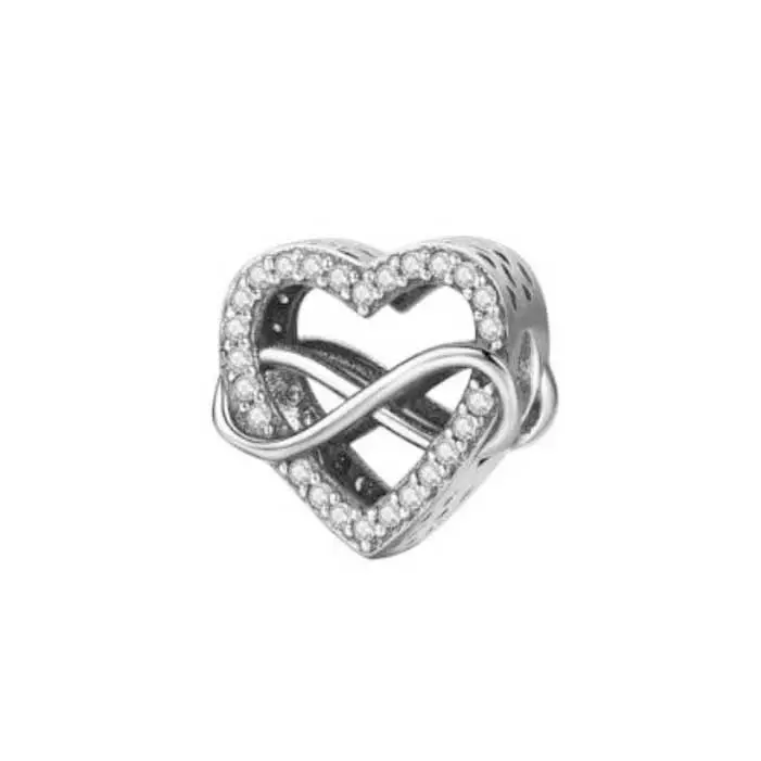 Kerro ikuisesta ystävyydestä tai rakkaudesta tällä sydämenmuotoisella charmiella-hopeahelalla. Korun reunoja kiertävät säihkyvät kirkkaat zirkonia-kivet, joita kiertää sileä hopeinen äärettömyys-symboli (infinity). Korun ilmava, läpinäkyvä muotoilu tuo siihen keveyttä ja antaa symbolin erottua kauniisti. Tämä ketjuun pujotettava hela on valmistettu aidosta 925 sterling-hopeasta. Helan leveys on 12 mm, korkeus 10 mm ja syvyys 9,5 mm.