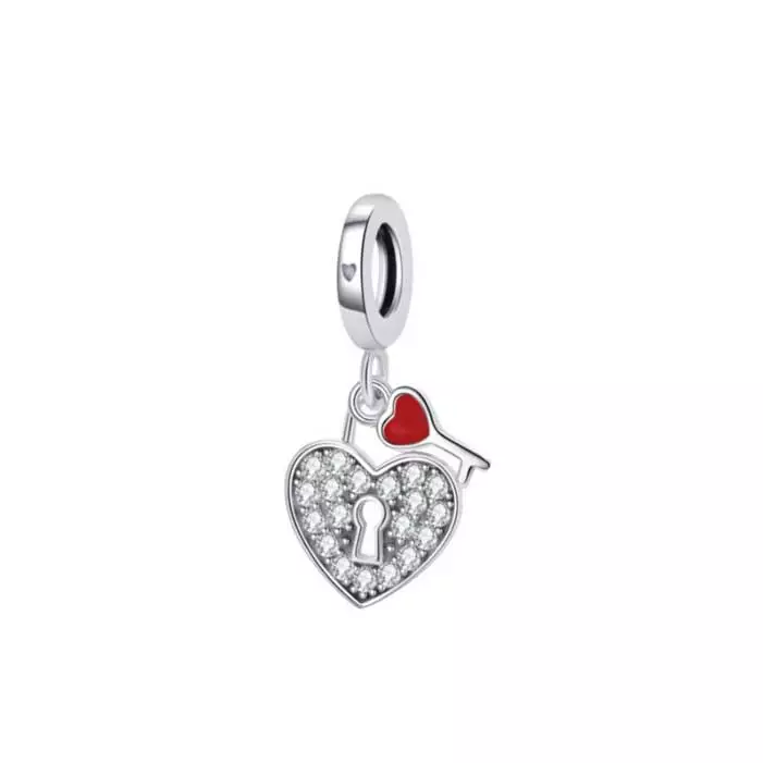 Tämä kaksiosainen hela on takuuvarma katseenvangitsija, jossa yhdistyvät kirkas säihke ja punainen tehosteväri. Sileästä hopearenkaasta laskeutuvat tiheästi zirkonia-kivillä päällystetty sydänlukko sekä avain, jonka punainen sydän tuo kokonaisuuteen terävän kontrastin. Tämä ketjuun pujotettava hela on valmistettu aidosta 925 sterling-hopeasta. Helan kokonaispituus on 21 mm, leveys 10 mm ja syvyys 8 mm.