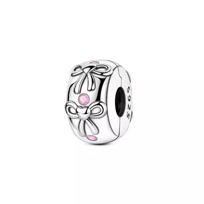 Tämä pyöreä Charmiella-klipsihela on täynnä tyttömäistä charmia. Helan pintaa kiertävät kohokuvioidut hopeiset rusetit, joiden yläpuolella säihkyy aina vaaleanpunainen zirkonia-kivi. Saranallisen kiinnityksen ansiosta helan voi napsauttaa joko rannekorun kierrekohtien päälle toimimaan ns. stopparina, joka pitää muut helat paikoillaan, tai kiinnittää koristeeksi vapaasti ketjun sileään osaan. Tämä avattava hela on valmistettu aidosta 925 sterling-hopeasta. Helan halkaisija on 11 mm ja leveys 5,5 mm.