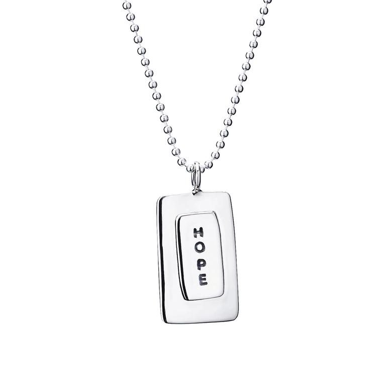 Naisten hopeinen riipus, jossa lukee "hope", eli toivo. Hopeaketjun pituus on valittavissa vaihtoehdoista 45 cm tai 50 cm. Laattariipuksen koko on 17 x 28 mm. Kaulakoru on valmistettu laadukkaasta 925 sterling-hopeasta.