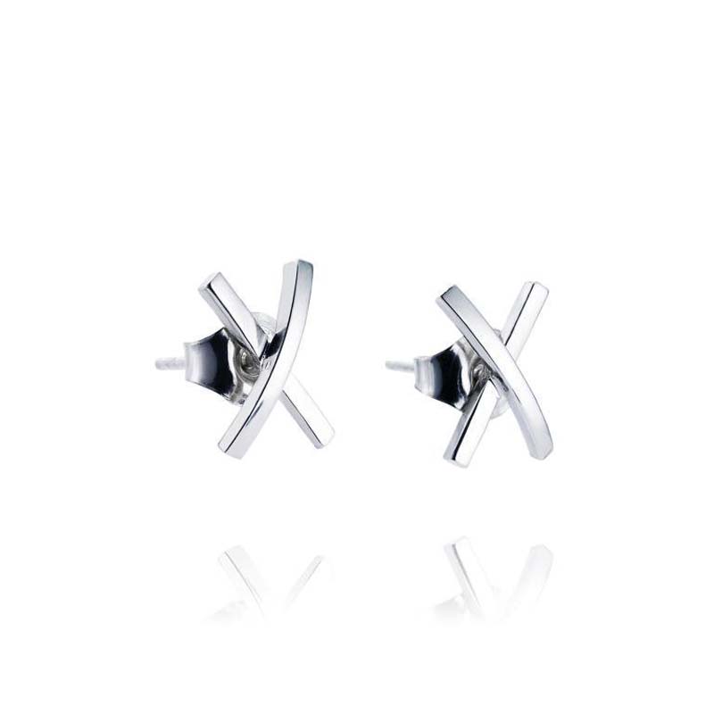Selkeälinjaiset naisten hopeiset korvakorut. Korvakorujen X-muotoisen koruosan koko on noin 9,3 x 7,3 mm. Korvakoruissa on tappikiinnitys.