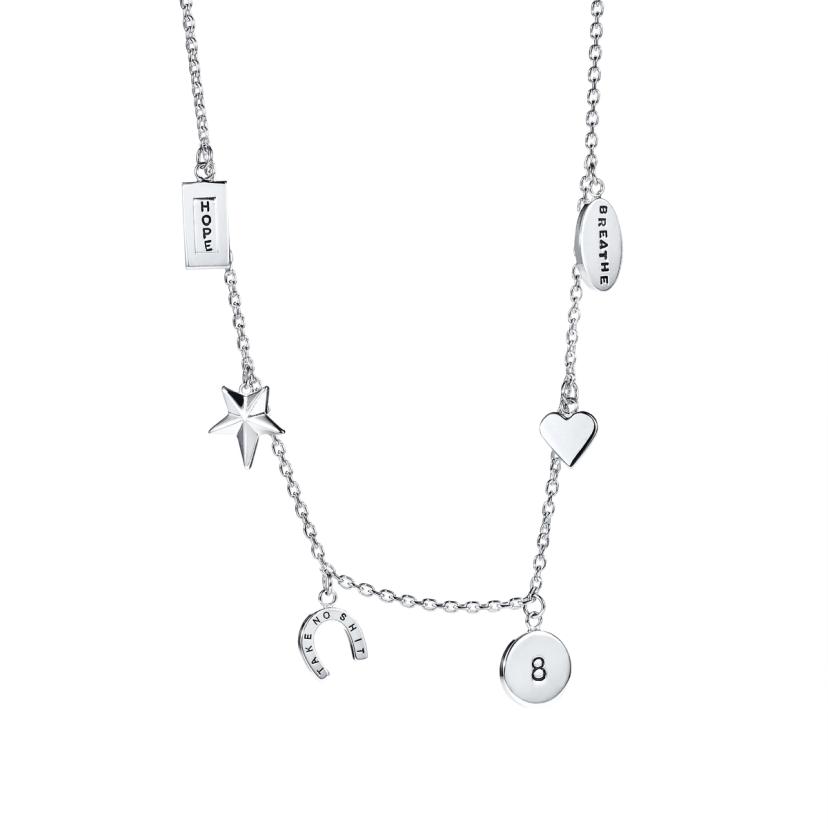 Naisten Efva Attling kaulakoru, joka ovat valmistettu kierrätetystä hopeasta. Kaulakoru koostuu kuudesta amuletista, jotka on kiinnitetty säädettävään ketjuun. Riipukset ovat tuttuja Efvan mallistosta: sydän; Baby luck -laatta, jossa on numero 8, Take no shit -hevosenkenkä, missä on teksti "Take no shit" ja Catch a falling star -tähti; Hope-laatta, johon on stanssattu sana " Hope" sekä soikea Breathe-laatta, johon on stanssattu "Breath". Ketjun pituus on säädettävissä 42/45/60 cm ja riipusten koot: Toivo: 12 x 6 mm. Tähti: 11 x 11 mm. Hevosenkenkä: 9 x 9,5 mm. Lucky 8: 11 mm.