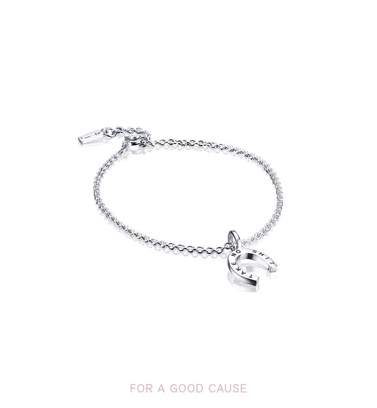 Rannekorussa on hopeinen hevosenkengänmuotoinen riipus, jossa on teksti "Take No Shit". Take No Shit -koruissa on vahva viesti, jonka tarkoituksena on antaa korun kantajalle voimaa ja rohkeutta kohtaamaan elämän eri haasteet. Riipuksen koko on 11,5 x 18,5 mm sekä ketjun pituus on valittavissa.