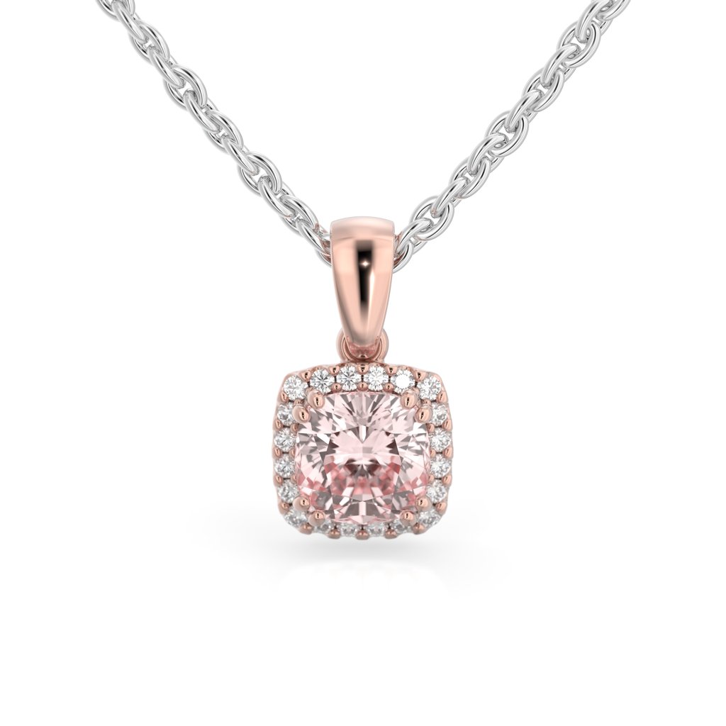 Festiven elegantti Elsa-timanttimorganiittiriipus, jonka keskipisteenä on vaaleanpunainen upea cushion-hiottu morganiitti. Riipuksen pyöristettyä neliökehää ympäröivät säihkyvät timantit. (Huomioithan, että ketju ei sisälly hintaan)