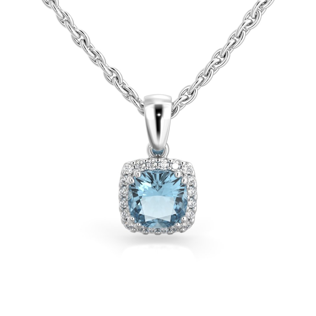 Festive Elsa timanttiriipus valkokulta 0,10 ct akvamariini Festiven elegantti Elsa-timanttiakvamariiniriipus, jonka keskipisteenä on vaaleansininen upea cushion-hiottu akvamariini. Riipuksen... Lue lisää