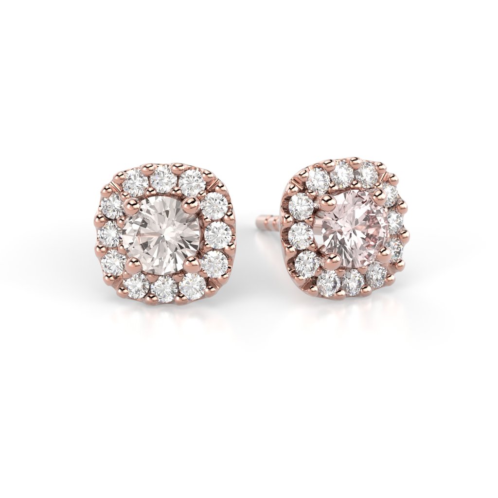Tyylikkäät Festive Janette-korvakorut, joiden keskipisteenä säihkyy kaunis vaaleanpunainen morganiitti. Pyöristettyä neliökehystä ympäröi 12 säkenöivää timanttia.