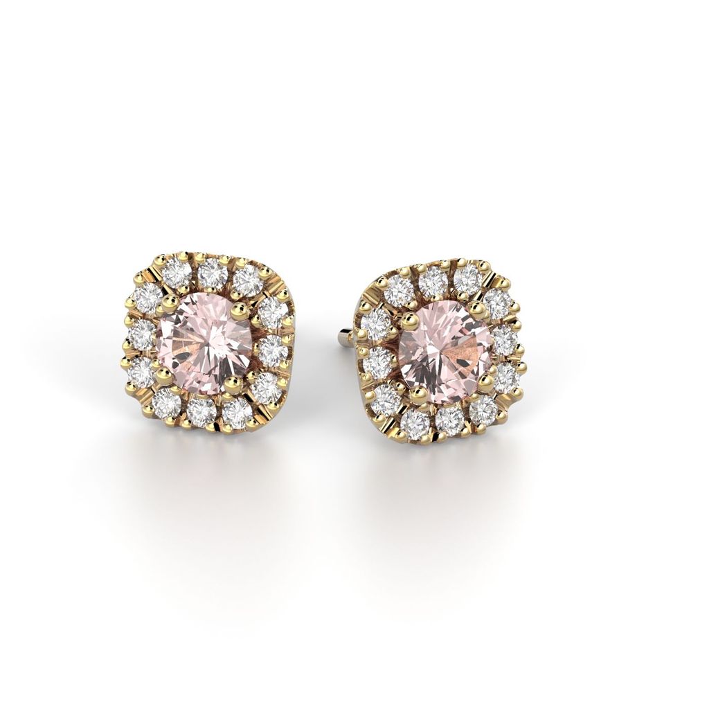 Näyttävät Josefiina korvakorut, joiden keskellä hehkuu upea vaaleanpunainen morganiitti sekä pienemmät timantit.