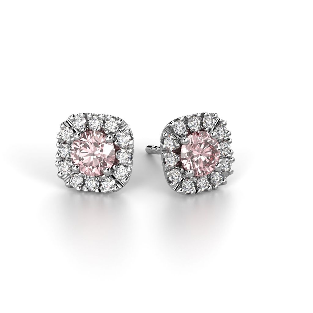 Näyttävät Josefiina korvakorut, joiden keskellä hehkuu upea vaaleanpunainen morganiitti sekä pienemmät timantit.