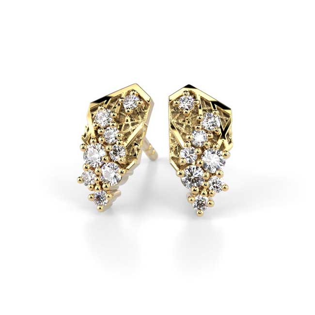 Festive Routa Rakka timanttikorvakorut. Särmikkäisiin korvakoruihin on istutettu yhteensä 16 säihkyvää timanttia, joiden yhteispaino on 0,21 ct. Kummassakin korvakorussa säihkyy kahdeksan erikokoista timanttia. Korvakoruissa on kaunis ja kiinnostava pintakuviointi, joka on saanut inspiraation talvisesta luonnosta. Rakka -korvakorut on valmistettu keltakullasta ja kullan pitoisuus on valittavissa. Korvakoruja on saatavilla 9k, 14k ja 18 karaatin keltakullasta valmistettuna. Korvakoru on 4,9 mm leveä ja 10,5 mm korkea. Yhteensopiva niin Routa Rakka- sormuksien kuin -riipuksienkin kanssa!