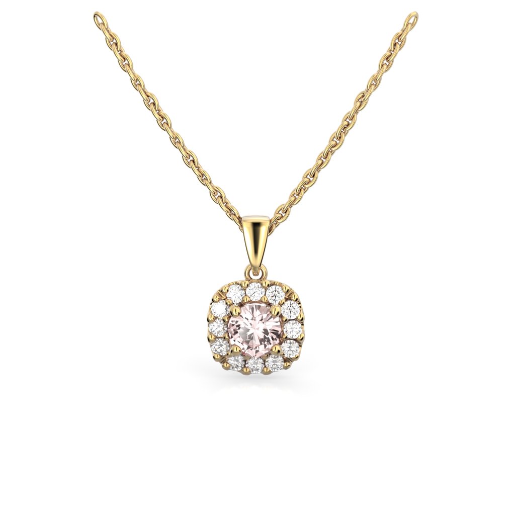 Tyylikäs Festive Janette-riipus, jonka keskipisteenä säihkyy kaunis vaaleanpunainen morganiitti. Pyöristettyä neliökehystä ympäröi 12 säkenöivää timanttia.