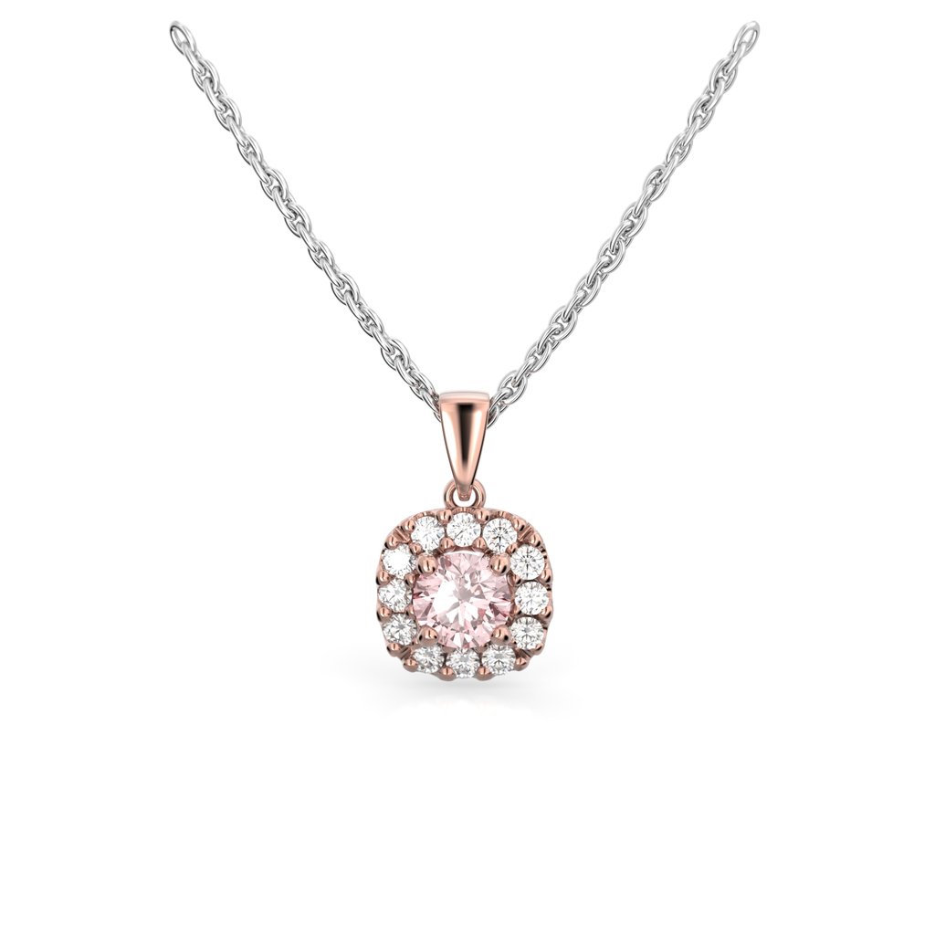 Tyylikäs Festive Janette-riipus, jonka keskipisteenä säihkyy kaunis vaaleanpunainen morganiitti. Pyöristettyä neliökehystä ympäröi 12 säkenöivää timanttia.