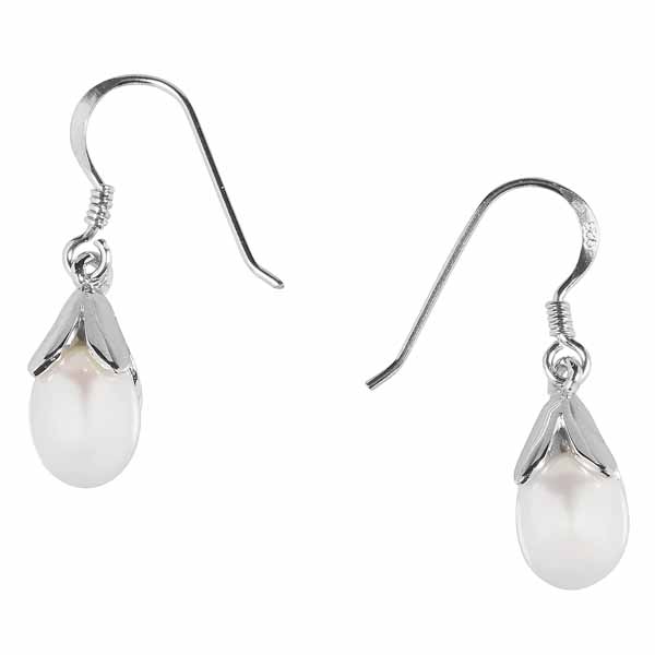 Hopeiset roikkuvat helmikorvakorut kauniilla kukkamaisella istutuksella. Korvakoruissa on klassinen koukkukiinnitys. Kauniiden vaaleiden helmien koko on 7 mm. Materiaali 925 hopea.