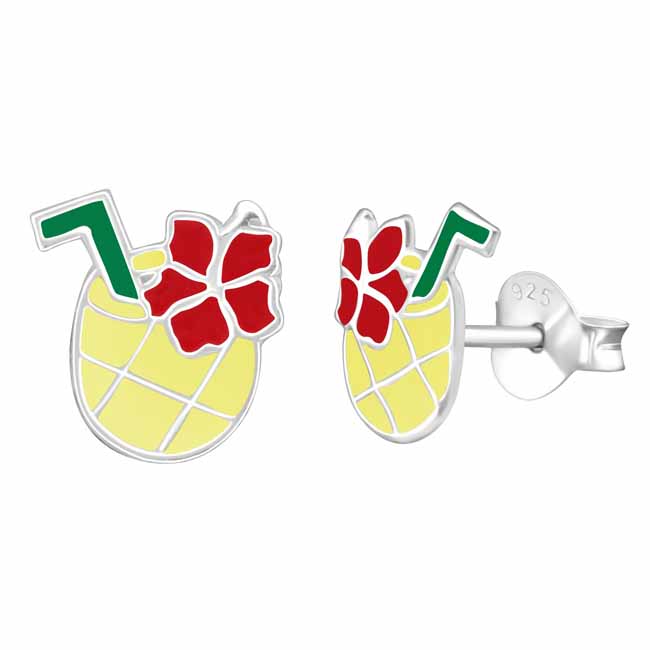 Lasten hopeiset ananas-korvakorut. Lasten hopeiset korvakorut keltaisella ananasjuomalla, jota koristavat vihreä pilli ja punainen kukka. Korvakoruissa on luotettava tappikiinnitys. Korvakorujen koko on 8 x 8 mm. Sirot ja kevyet nappikorvakorut, joita lapsi voi käyttää arjessa! Korvakorujen valmistusmateriaali on laadukas nikkelitön 925 sterling hopea.