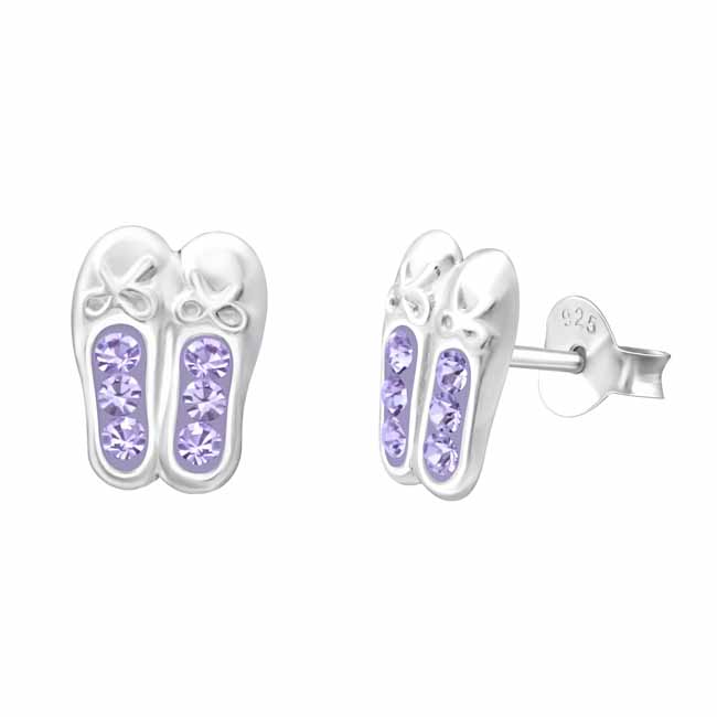 Lasten hopeiset balettitossu-korvakorut lilan värisillä zirkoneilla. Kauniita balettitossuja koristavat violetit korukivet. Korvakoruissa on luotettava tappikiinnitys. Korvakorujen koko on 7 x 9 mm. Sirot ja kevyet nappikorvakorut, joita lapsi voi käyttää arjessa! Korvakorujen valmistusmateriaali on laadukas nikkelitön 925 sterling hopea.