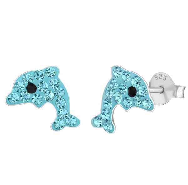 Lasten hopeiset delfiini-korvakorut vedenvihreillä korukivillä. Säihkyvät lasten hopeiset korvakorut turkoosilla delfiinillä. Korvakoruissa on luotettava tappikiinnitys. Korvakorujen koko on 12 x 10 mm. Sirot ja kevyet nappikorvakorut, joita lapsi voi käyttää arjessa! Korvakorujen valmistusmateriaali on laadukas nikkelitön 925 sterling hopea.