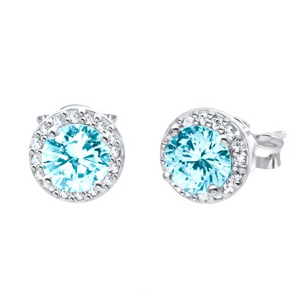 Hopeiset korvakorut pyöreällä vaaleansinisellä zirkonia-korukivellä, jota ympäröivät kirkkaat zirkoniat. Nappikorvakorujen koko on 6 mm ja niissä on luotettava tappikiinnitys.