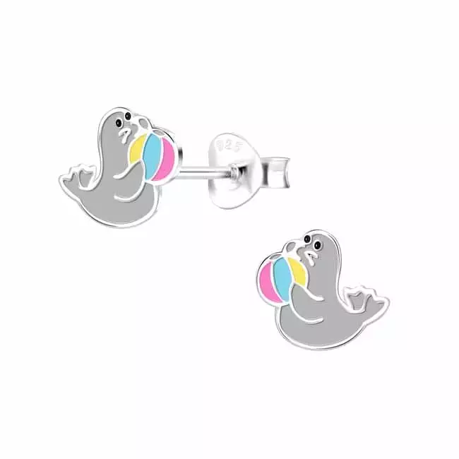 Lasten hopeiset hylje-korvakorut. Hellyyttävät eläinkorvakorut harmailla hylkeillä, jotka pitelevät värikästä rantapalloa. Korvakorun koko on 6 x 7 mm. Korvakoruissa on luotettava tappikiinnitys. Sirot ja kevyet nappikorvakorut, joita lapsi voi käyttää joka päivä! Korvakorujen valmistusmateriaali on laadukas nikkelitön 925 sterling hopea.