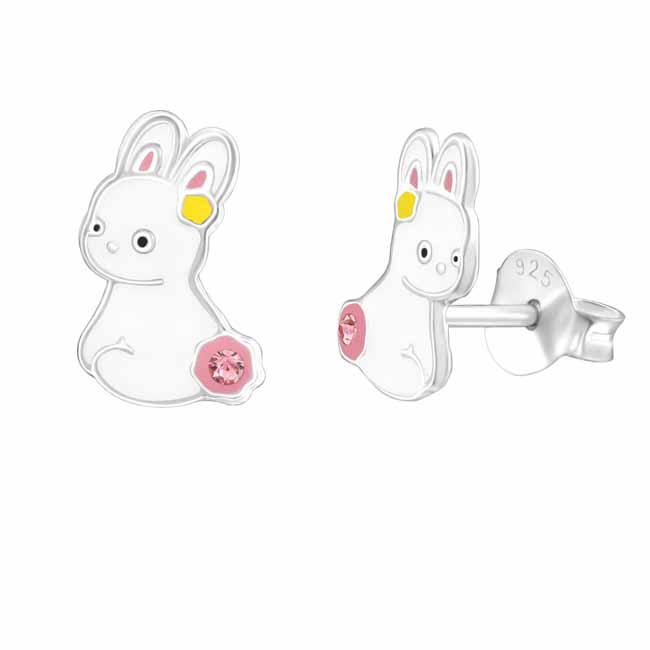 Lasten hopeiset pupu-korvakorut. Näissä suloisissa lasten hopeisissa korvakoruissa esiintyy valkoinen istuva kani. Jäniksen häntätupsuna toimii vaaleanpunainen zirkonia. Korvakoruissa on luotettava tappikiinnitys. Korvakorujen koko on 6 x 9 mm. Sirot ja kevyet nappikorvakorut, joita lapsi voi käyttää arjessa! Korvakorujen valmistusmateriaali on laadukas nikkelitön 925 sterling hopea.