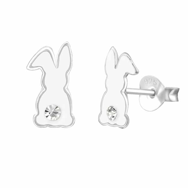 Lasten hopeiset pupu-korvakorut. Hellyyttävät lasten hopeiset korvakorut valkoisilla istuvilla kaneilla. Jänisten häntätupsuina kimaltelevat kirkkaat zirkonit. Korvakoruissa on luotettava tappikiinnitys. Korvakorujen koko on 5 x 10 mm. Sirot ja kevyet nappikorvakorut, joita lapsi voi käyttää arjessa! Korvakorujen valmistusmateriaali on laadukas nikkelitön 925 sterling hopea.