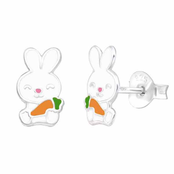 Lasten hopeiset pupu-korvakorut. Näissä suloisissa hopeisissa kani-korvakoruissa ihastuttaa iloinen valkoinen jänis, joka pitelee porkkanaa. Korvakoruissa on luotettava tappikiinnitys. Korvakorujen koko on 6 x 10 mm. Sirot ja kevyet nappikorvakorut, joita lapsi voi käyttää arjessa! Korvakorujen valmistusmateriaali on laadukas nikkelitön 925 sterling hopea.