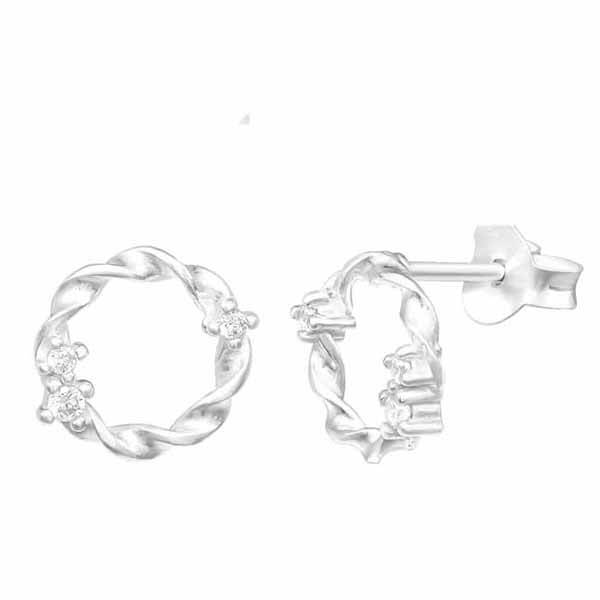 Hopeiset kehän muotoiset korvakorut. Näissä ympyrän muotoisissa hopeakorvakoruissa on tyylikäs kierre ja kirkkaita zirkoneita koristamassa kokonaisuutta. Nappikorvakorujen koko on 9 x 9 mm ja niissä on luotettava tappikiinnitys. Valmistusmateriaali on laadukas nikkelitön 925 sterling hopea. Sirot hopeiset nappikorvakorut kulkevat erinomaisesti mukana arjessa ja sopivat moneen tyyliin!
