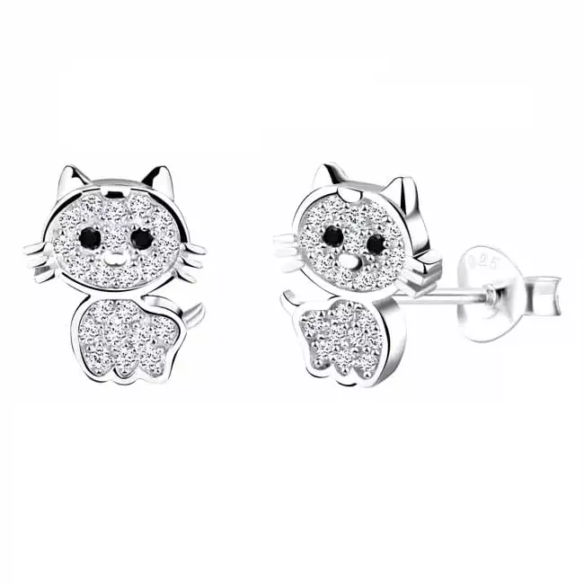 Lasten hopeiset kissa-korvakorut. Herttaiset korvakorut kissoilla, jotka on koristeltu kirkkailla zirkonia-korukivillä. Korvakorun koko on 8 x 10 mm. Korvakoruissa on luotettava tappikiinnitys. Korvakorujen valmistusmateriaali on laadukas nikkelitön 925 sterling hopea.