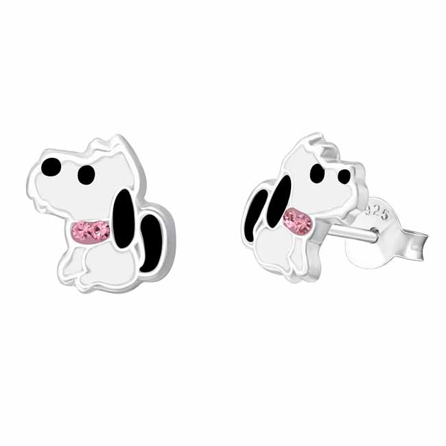 Lasten hopeiset koira-korvakorut. Suloiset hopeiset koirakorvakorut muistuttavat Snoopy-koiraa! Koiran kaulassa säkenöi pinkit zirkoniat. Korvakoruissa on luotettava tappikiinnitys. Korvakorujen koko on 9 x 9 mm. Sirot ja kevyet nappikorvakorut, joita lapsi voi käyttää arjessa! Korvakorujen valmistusmateriaali on laadukas nikkelitön 925 sterling hopea.