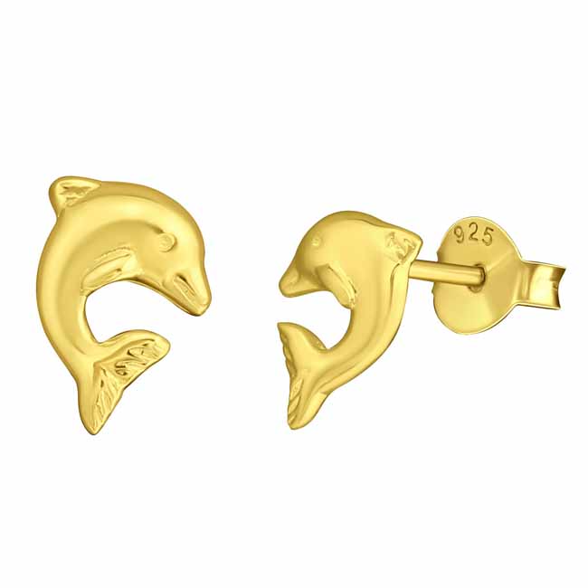 Lasten hopeiset delfiini-korvakorut kultapinnoitteella. Suloiset kullatut delfiini-hopeakorvakorut. Korvakoruissa on luotettava tappikiinnitys. Korvakorujen koko on 6 x 8 mm. Sirot ja kevyet nappikorvakorut, joita lapsi voi käyttää arjessa! Korvakorujen valmistusmateriaali on laadukas nikkelitön 925 sterling hopea.