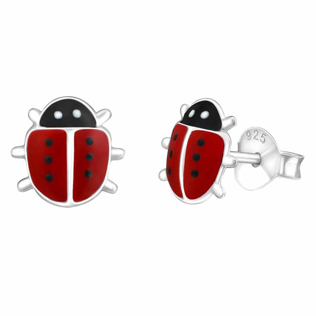 Lasten hopeiset leppäkerttu-korvakorut. Punaiset leppäkerttu-korvakorut ihastuttavat suloisuudellaan! Korvakoruissa on luotettava tappikiinnitys. Korvakorujen koko on 8 x 8 mm. Sirot ja kevyet nappikorvakorut, joita lapsi voi käyttää arjessa! Korvakorujen valmistusmateriaali on laadukas nikkelitön 925 sterling hopea.